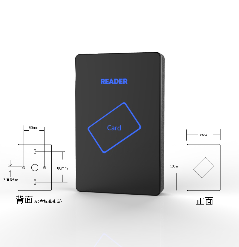外觀,高端大氣,外觀時尚可適用于86盒按裝具有時間段管理,扣費、扣次功能可以聯網遠程操作,開門、授權、提取記錄可外接出門按鈕寬電壓設計:DC 9-24V適用于ISO4443A協議,Mifare1 13.56MHZ IC卡規格尺寸:135x85x20(mm)